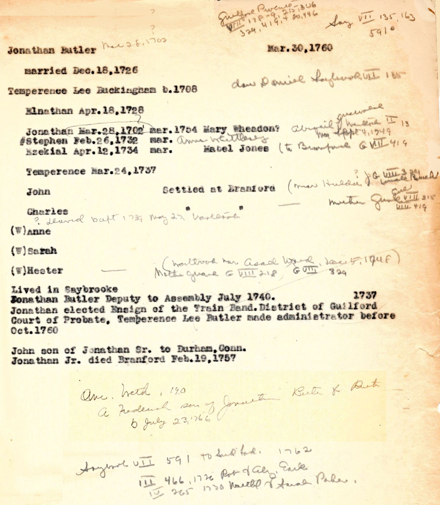 Jonathan was elected Ensign of the Train Band in the District of Guilford in 1737.