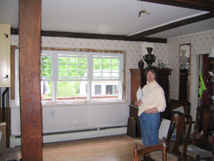 June 9th: An inside view of the new dining room windows and a very pleased Ruby.