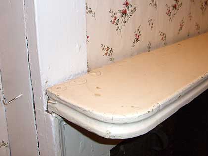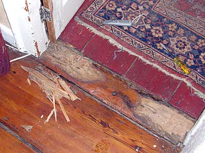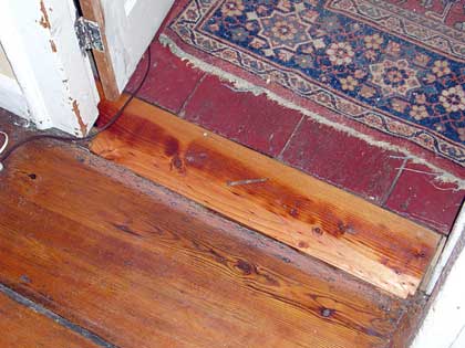 Door sill to south living room before and after. I believe the old sill had been damaged by water from the old radiators. I installed the new sill using the original hand-cut nails.