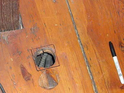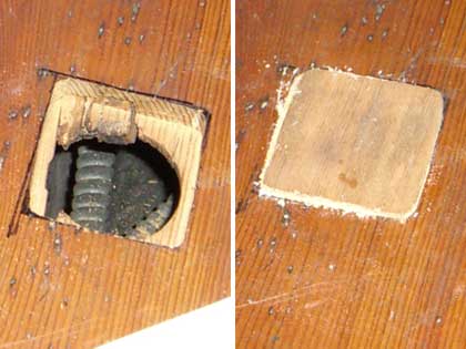 One of several holes left hehind when radiators were removed. The detail pictures show how I routed out a square patch, leaving a ridge so that the plug can be glued solidly.