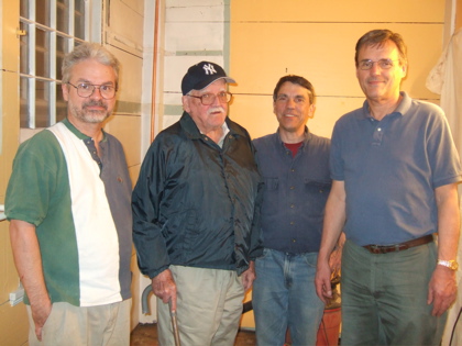 Nathan, Curly, David and Tol stand in the empty bathroom.
