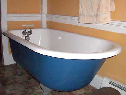 Clawfoot bathtub newly installed in downstains bath and a picture of Jackie, Nathan and David using the bathtub in 1957 when it was upstairs.