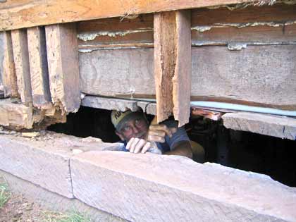 Using a beam salvaged from the old barn Bob fashions it as a replacement.