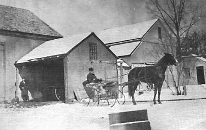 George P. Savage in sleigh, circa 1910. The original barn is visible on the left. It was partially destroyed in a hurricaine in 1938.