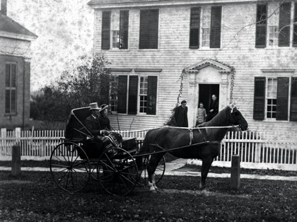 George P. Savage and Cary Savage sit in a horse and carriage. Ralph Bulkley Savage stands beside the original entry to the homestead.